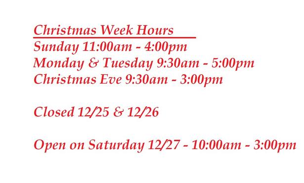 Please note that we will be closed for Winter break from Dec. 25th through Jan. 31st. Re-Opening On Wednesday, February 4th.